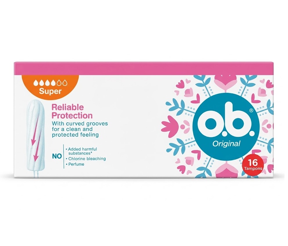 טמפוני או-בה (o.b.) סופר ללא מוליך, המעניקים הגנה מקסימלית לזרימה כבדה ושומרים על רעננות לאורך זמן.