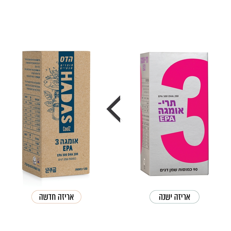 תרי-אומגה EPA כמוסות שמן דגים הדס תוסף תזונה המכיל חומצות שומן חיוניות מסוג אומגה 3, שהגוף אינו מייצר בעצמו. חומצות EPA ו-DHA משתתפות במגוון תהליכים תפקודיים ותומכות באיזון תזונתי יומיומי.