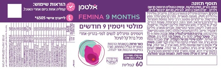 • רכיבים מרכזיים: חומצה פולית (400 מק"ג), ברזל עדין (30 מ"ג), יוד (220 מק"ג), ויטמין D3 (400 יחב"ל), סידן (250 מ"ג) וקומפלקס ויטמיני B.