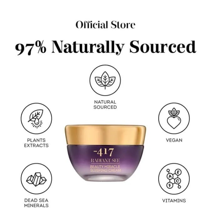 מינוס 417 - קרם לילה טבעוני “Radiant See Beauty Miracle” מעניק הזנה עמוקה, לחות מתמשכת ושיקום העור בזמן השינה. מועשר מינרלים מים המלח, שמנים טבעיים, תמציות קמומיל וחוחובה וויטמינים A, B, C, E ו-F. משפר גמישות, מעניק זוהר טבעי בבוקר ומגן מפני נזקי סביבה. מתאים לכל סוגי העור.