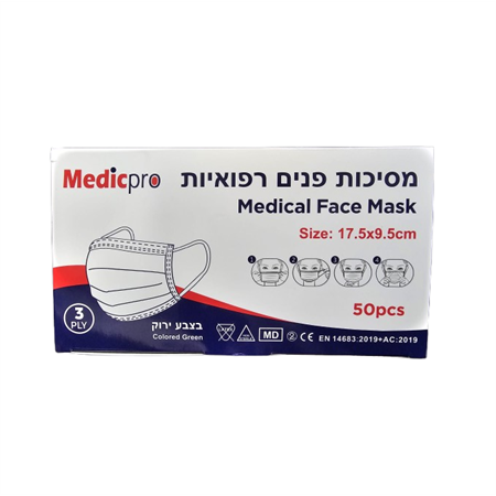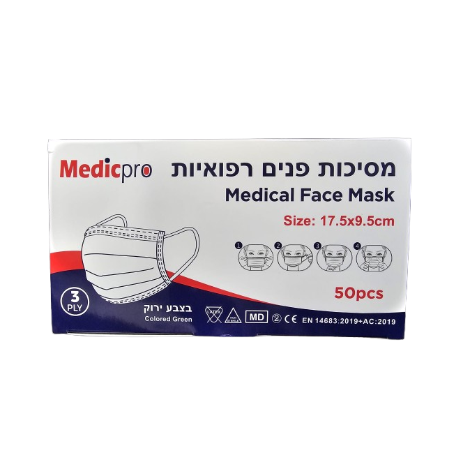מסיכת פנים רפואית 3 שכבות צבע ירוק | Medicpro