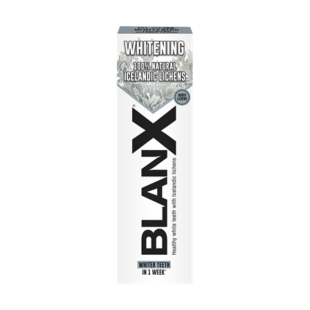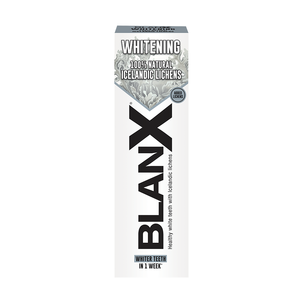 BlanX® Whitening היא משחת שיניים מלבינה המבוססת על ליכן איסלנדי טבעי, הידוע בפעילות בקטריוסטטית ותמיכה בהפחתת פלאק וכתמי שטח. הפורמולה החדשה מועשרת בכמות גבוהה יותר של ליכנים, לשמירה על מראה שיניים לבן ובריא.