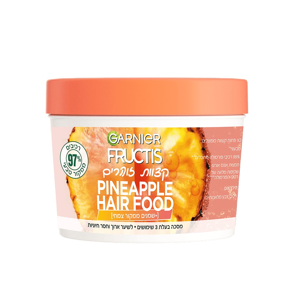 מסכת הזנה לשיער FRUCTIS HAIR FOOD אננס, עם ניחוח עדין ומשגע של אננס, פורמולה טבעונית המכילה 97% רכיבים טבעיים ואינה מכילה סיליקונים או צבעים מלאכותיים. המוצר מעניק שיער ארוך וחסר חיוניות קצוות זוהרים וברק מוגבר, ומפחית פי 2 את הקצוות הפוצלים. מתאים לשיער ארוך ומיועד להזנה אינטנסיבית.