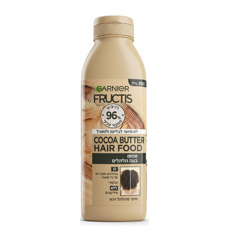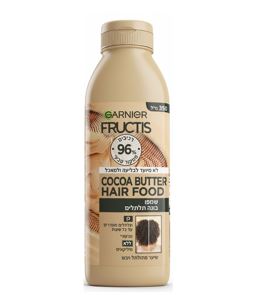 שמפו לשיער יבש ומתולתל מסדרת Fructis Hair Food של Garnier, להזנה אינטנסיבית ולשיפור מראה השיער. פורמולה עשירה בחמאת קקאו המסייעת להעניק לחות עמוקה, רכות וגמישות, ומותירה את השיער מוזן ונעים למגע כבר מהשימוש הראשון.