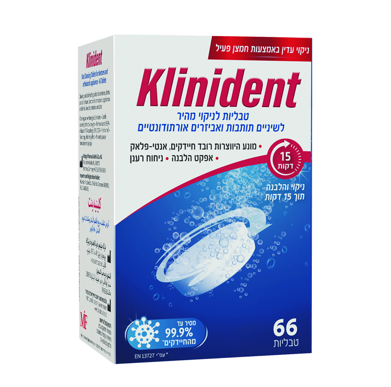 טבליות KLINIDENT לניקוי מהיר ויעיל של שיניים תותבות ואביזרים אורתודנטיים. מסירות עד 99.9% מהחיידקים*, מעניקות אפקט הלבנה וניחוח רענן תוך 15 דקות בלבד. השימוש בטבליות קל ופשוט: יש להשרות את האביזרים במים חמים יחד עם טבליה אחת, להמתין עד לסיום התהליך ולשטוף היטב לפני השימוש. מתאימות לניקוי יומיומי לשמירה על היגיינה ורעננות האביזרים. כשר פרווה בהשגחת מאור הכשרות ובאישור הרבנות לישראל