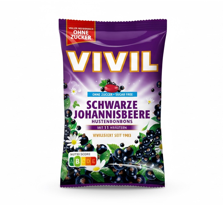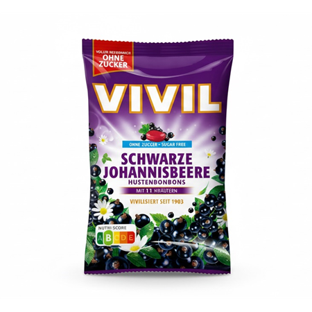 סוכריות ללא סוכר מבית Vivil בטעם דומדמניות שחורות, בתוספת ויטמין C ותמציות צמחים. מאושרות על ידי האגודה הישראלית לסוכרת. כשרות פרווה בהשגחת בד"צ חוג חתם סופר ואישור הרבנות הראשית לישראל.