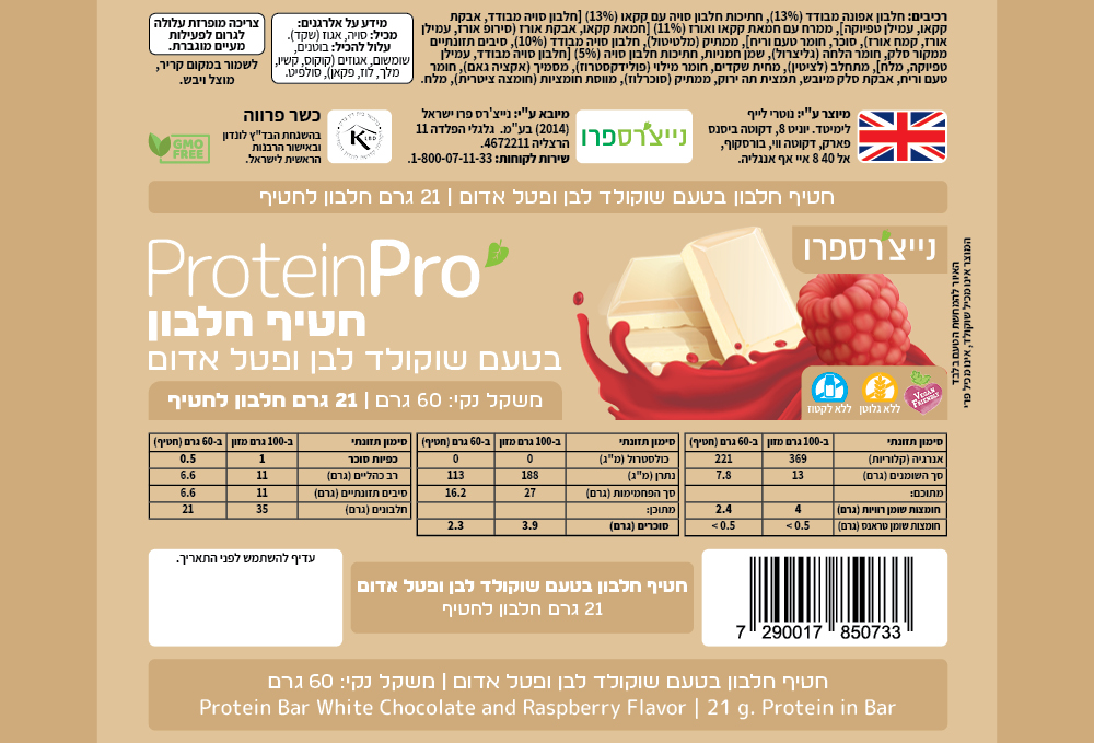 החטיף מכיל 21 גרם חלבון באיכות גבוהה, ופותח במיוחד עבור הטעם הישראלי.