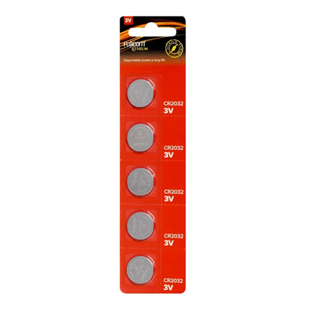 מארז חיסכון הכולל 5 סוללות ליתיום כפתור מסוג CR2032 במתח 3V מבית Fujicom. מתאימות לשימוש בשלטים, מחשבונים, משקלים דיגיטליים, שעונים, צעצועים ומכשירים אלקטרוניים קטנים נוספים התומכים בסוללת CR2032.