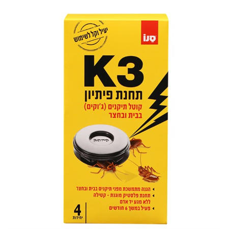 K3 תחנת פיתיון לתיקנים מיועדת להדברה יעילה של תיקנים בבית ובחצר, באמצעות מנגנון פיתיון חכם וללא מגע יד אדם. התחנה מושכת את התיקנים בזמן חיפושם אחר מזון ומים, מאפשרת להם לצרוך את הפיתיון ולשאת אותו חזרה לקן, שם מתבצעת קטילה מתמשכת של תיקנים נוספים.
